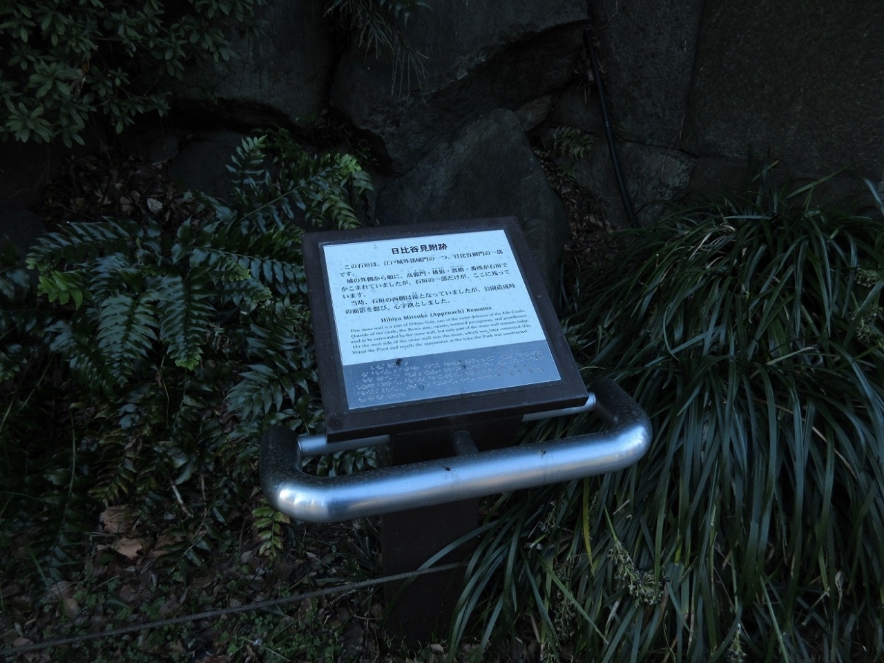 若いころに東京で生活していたので、日比谷公園自体は知っていたのですが、改めて皇居に近い北東側からから今回入ったところ、立派な城門跡の石垣が残されていて、思わず立ち止まりました。【日比谷見附跡】との説明書きが近くに設置されており、四谷見附などと同様の江戸城警備のための城門が設置されていたとのこと。石垣は高さこそあまりありませんが、大きな石が隙間なく積まれており、当時の技術の高さを感じさせてくれました。
