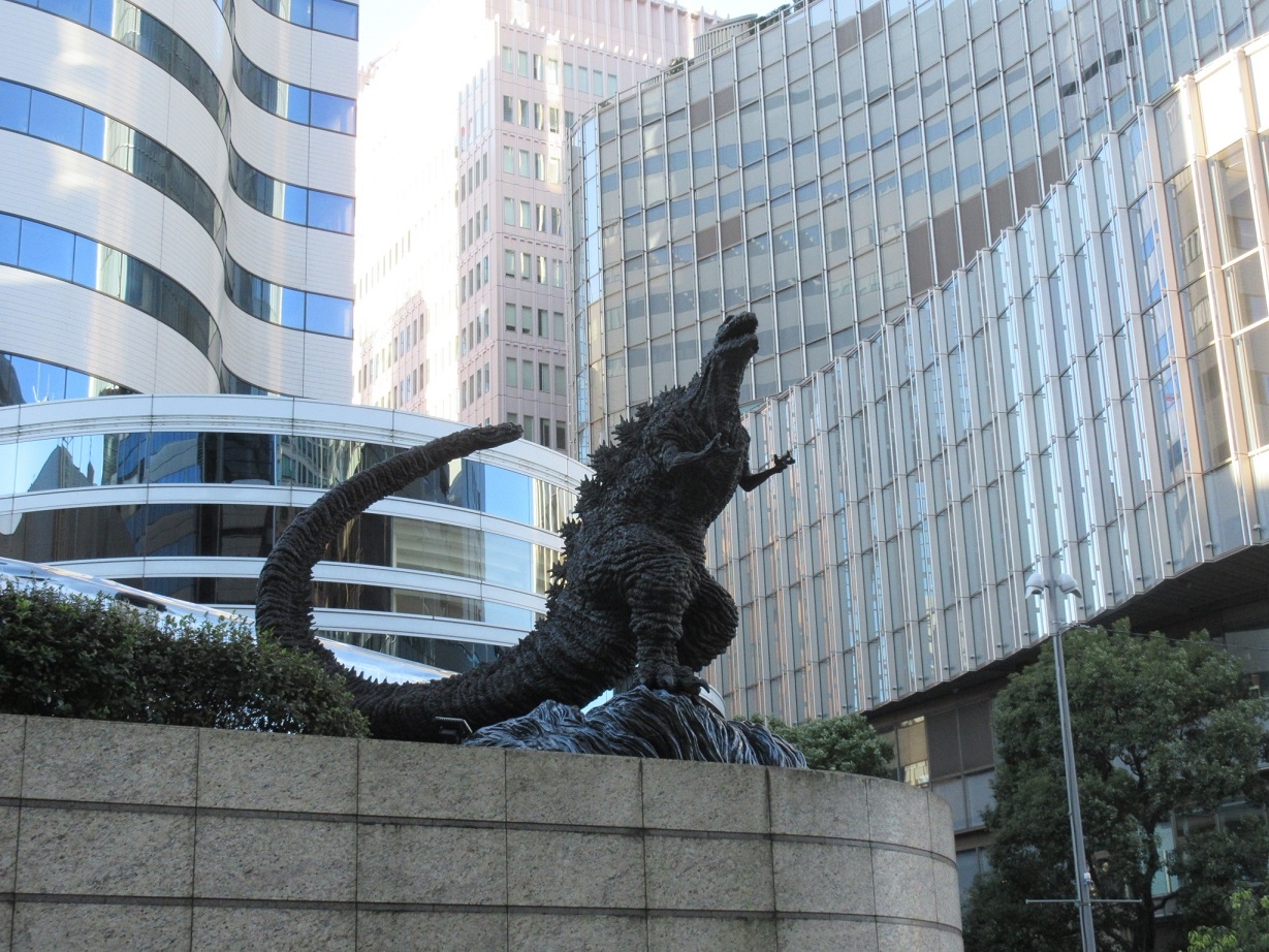 有楽町駅界隈を散策していた際、ミッドタウン日比谷に隣接する広場の、地下駐車場へ向かうゲートの上の少し高い場所に、ゴジラの像が設置されていました。ここがいわゆる【ゴジラスクエア】なのですが、設置されているゴジラ像は初代の昭和のゴジラよりも、平成の時代の【シンゴジラ】に近い風貌のように感じられました。