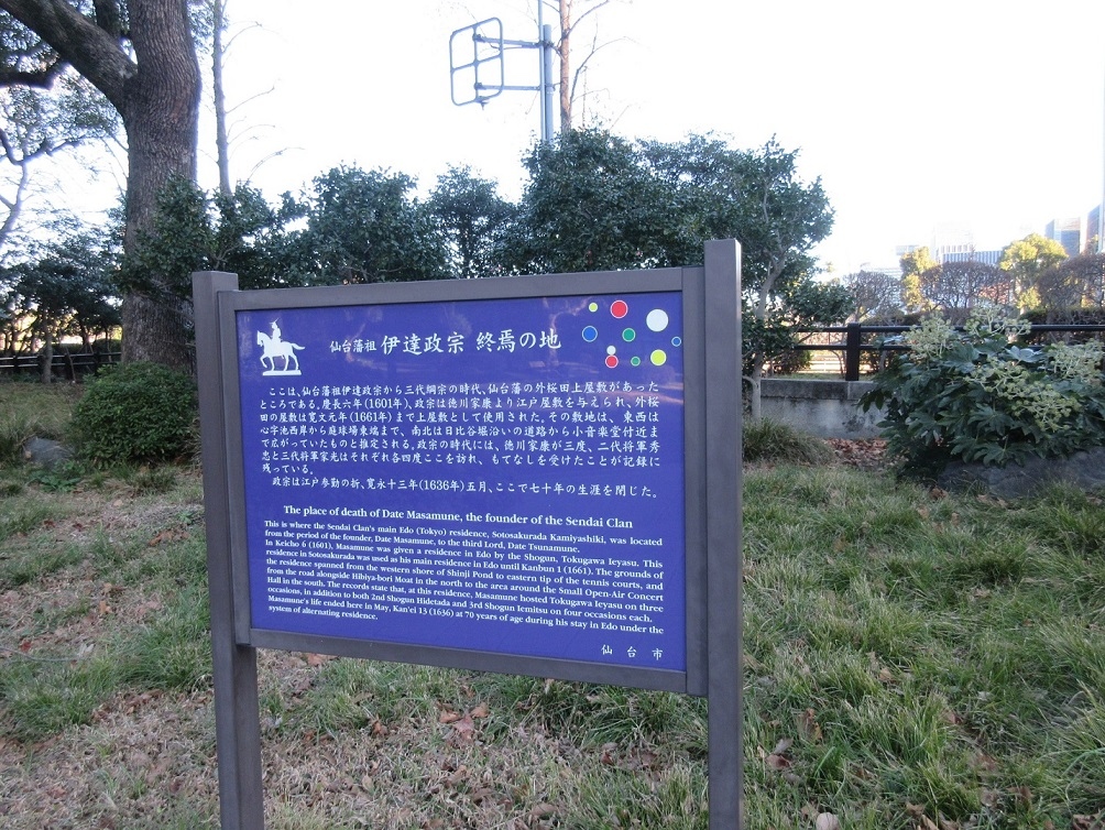 日比谷公園をのんびり散策した際、【日比谷見附跡】からほど近い場所に、【伊達政宗終焉の地】を示す大きな説明板が設置されていました。建て政宗の騎馬像がシルエットとして描かれており、思わず足を止めました。戦国武将のイメージが強かったのですが、江戸に幕府が置かれたのち、この地にあった伊達藩の屋敷で最後の時を迎えたことを知りました。他の説明書きと異なる青地に白抜きとなった説明板は、それだけでインパクトがありました。