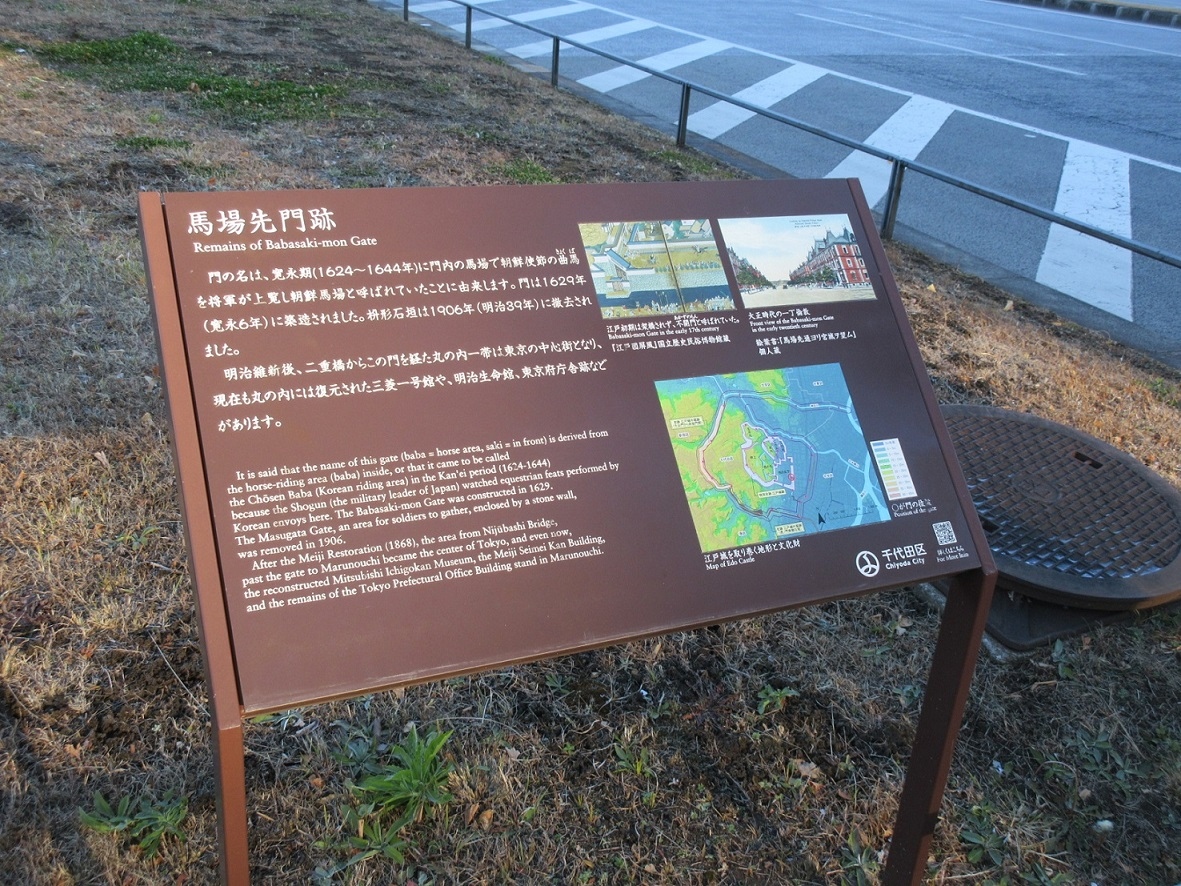 地下鉄の日比谷公園駅から程違い場所にある江戸城の遺構の一つで、今は看板があるのみですが、かつて朝鮮使節の曲馬を将軍が上覧したことから、【馬場先門】と呼ばれたといった説明文があって理解の助けとなりました。さらに説明文には江戸の地図も添えられていて、江戸時代のお堀が現在の東京のどの界隈にあたるのも、非常に分かりやすかったです。