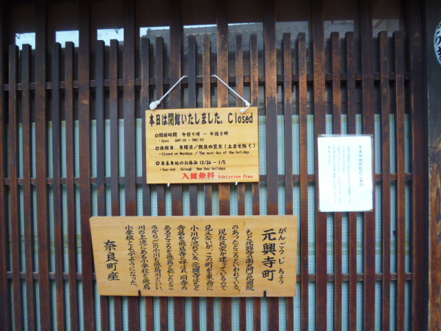 奈良町散策の際に夕方訪問したのですが、すでに閉館していました。市内循環バスで田中町下車し徒歩3分ほどで到着しますからアクセスは非常に良いです。ならまちの伝統的な町屋建築を再現した施設で入館無料とのこと。