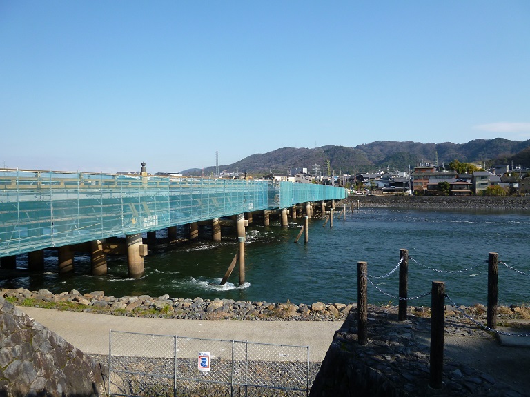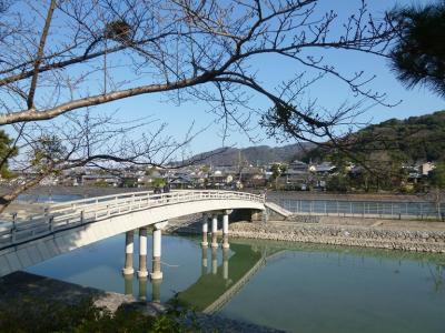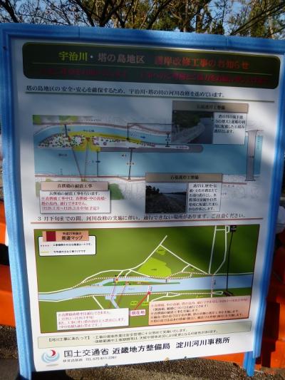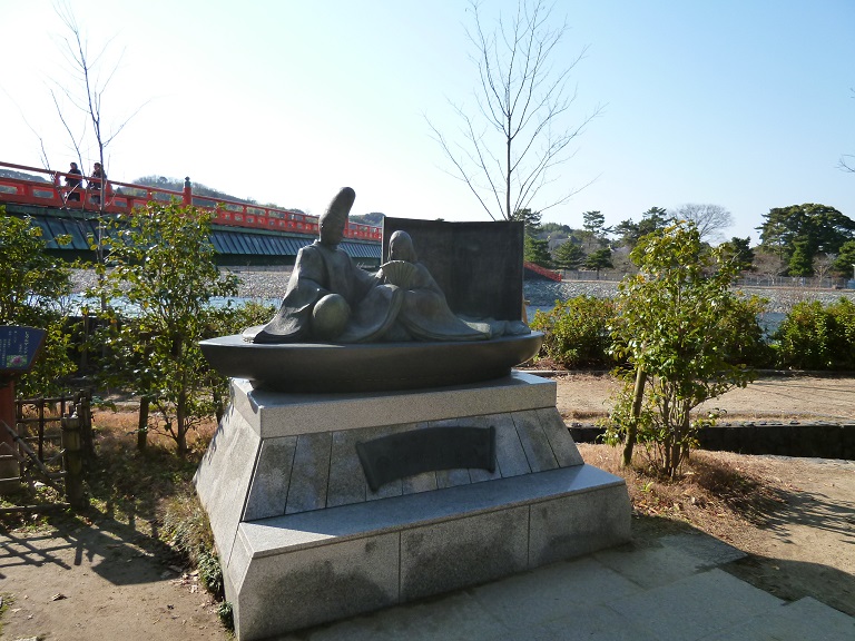 朝霧橋を東側に渡ると宇治神社の前に小さな公園があり、宇治十帖モニュメントを立っています。このモニュメントは、源氏物語の中でヒロイン「浮舟」と「匂宮」が小舟で宇治川に漕ぎ出す場面に題材をとっており、源氏物語ファンには興味深い場所ではないでしょうか。