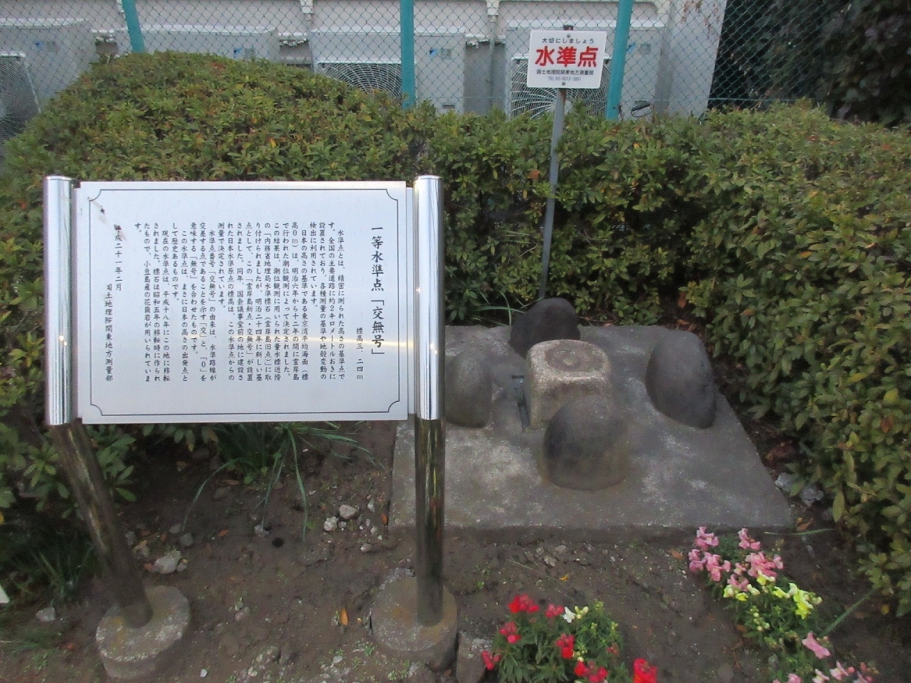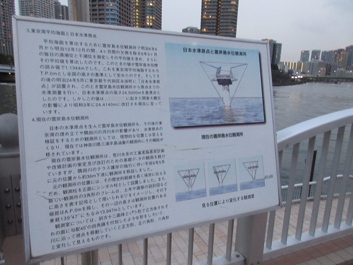 佃島から中央大橋を新川側にわたった場所に、【一等水準点交無号】がありました。大きな碑文ではないので、少し探しましたが。。。幸い満潮時と干潮時を水位測定に始まり、地味な作業を経て明治24年に設置されたこと等を記した説明板がありそれと分かりました。日本各地のいわゆる標高が、この【交無号】を基準に算出されたことを考えると、とても興味深く感じられました。