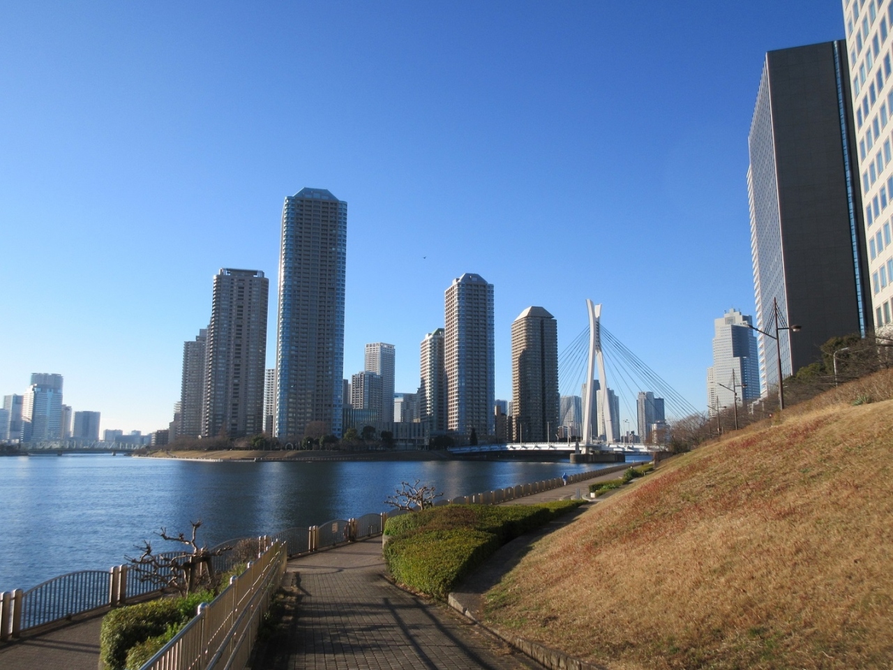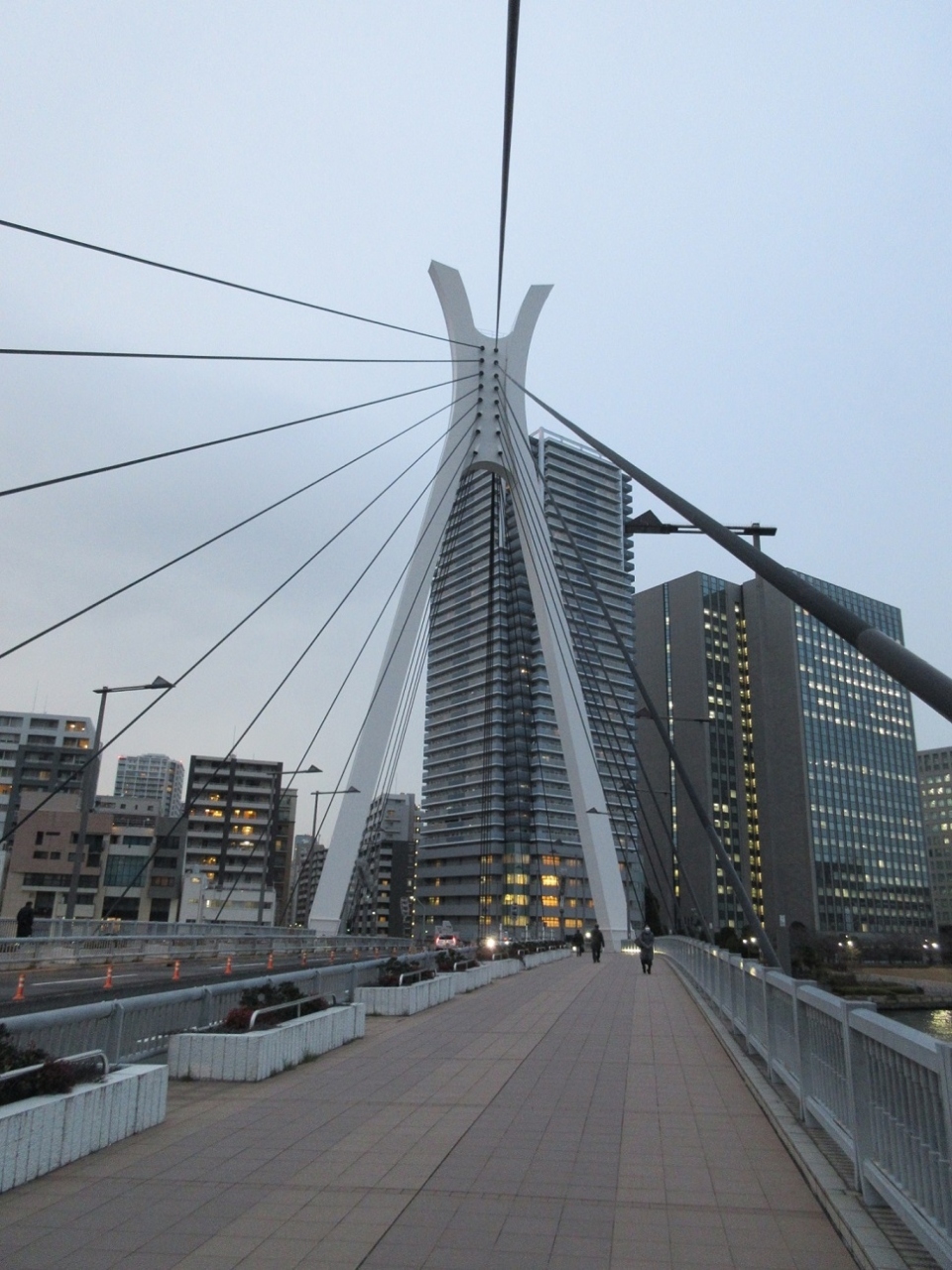 中央大橋はドラマでもたびたび登場するデザイン性の良い橋で、永代橋方面から見ると隅田川の中州である佃島の高層マンション群と相まって、一度見たら忘れられない素晴らしい景観を形作っていました。実際に橋を歩いて渡ると、隅田川の上流には永代橋が見え、東京でも指折りの景観を楽しめました。