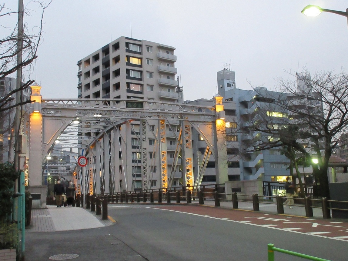 八丁堀界隈を散策した際、新川地区から南の入船にわたる際に歩いたのがこちらの【南高橋】です。関東大震災からの復興事業で架橋されたとのことで、エッフェル塔のように鉄の造形美の美しさが感じられる、ほれぼれするほど美しい橋でした。夜にライトアップされた姿もまた格別です。