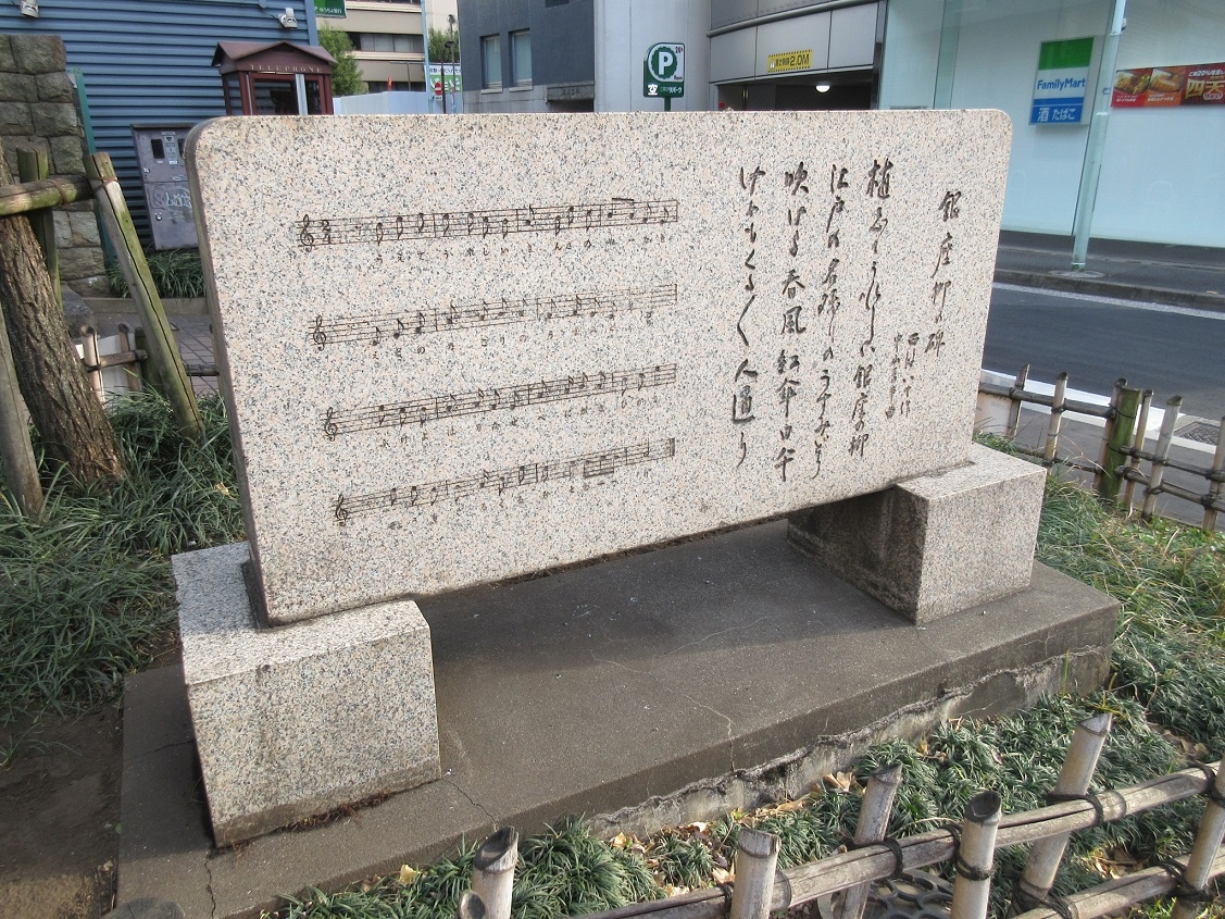 銀座八丁目から首都高を超えて新橋駅に向かっていくと、道沿いに【銀座の柳の碑】が設置されており、しばし足をとめました。石碑には五線譜と歌詞が刻まれており、関東大震災からの復興を込めて銀座に柳の木が植えられたことを喜びをもって歌い上げたのが、昭和7年の「銀座の柳」という歌であったことが説明されていました。古賀政男の東京ラプソディーという歌にも、「銀座の柳の下で~、待つは君ひとり~君ひとり~」という歌詞がありますが、この【銀座の柳の碑】を読むと、その歌詞に込められたメッセージも理解できるように思えました。