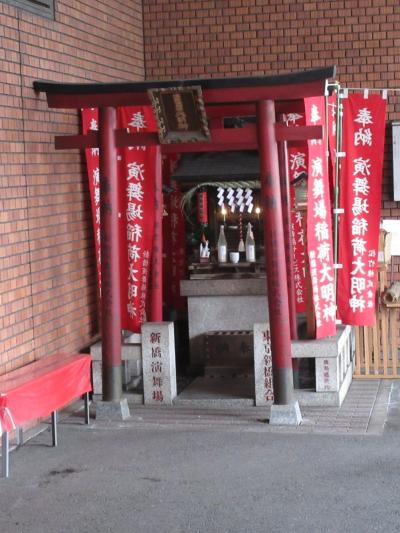 歌舞伎座界隈を散策して新橋にある新橋演舞場を訪問した際に、そのすぐ脇にある【演舞場稲荷大明神】にも立ち寄りました。駐車場の方に入った先にあるので、自動車の通りがある時は注意が必要ですが、それ以外は参拝する方もおらずに空いています。演舞場の敷地の中なので、歴史の古いお稲荷さんではないようですが、小さいながらも赤い鳥居があって体裁は整っていました。