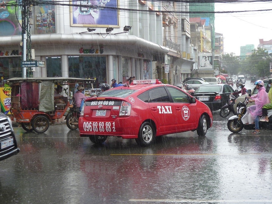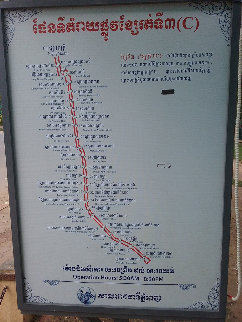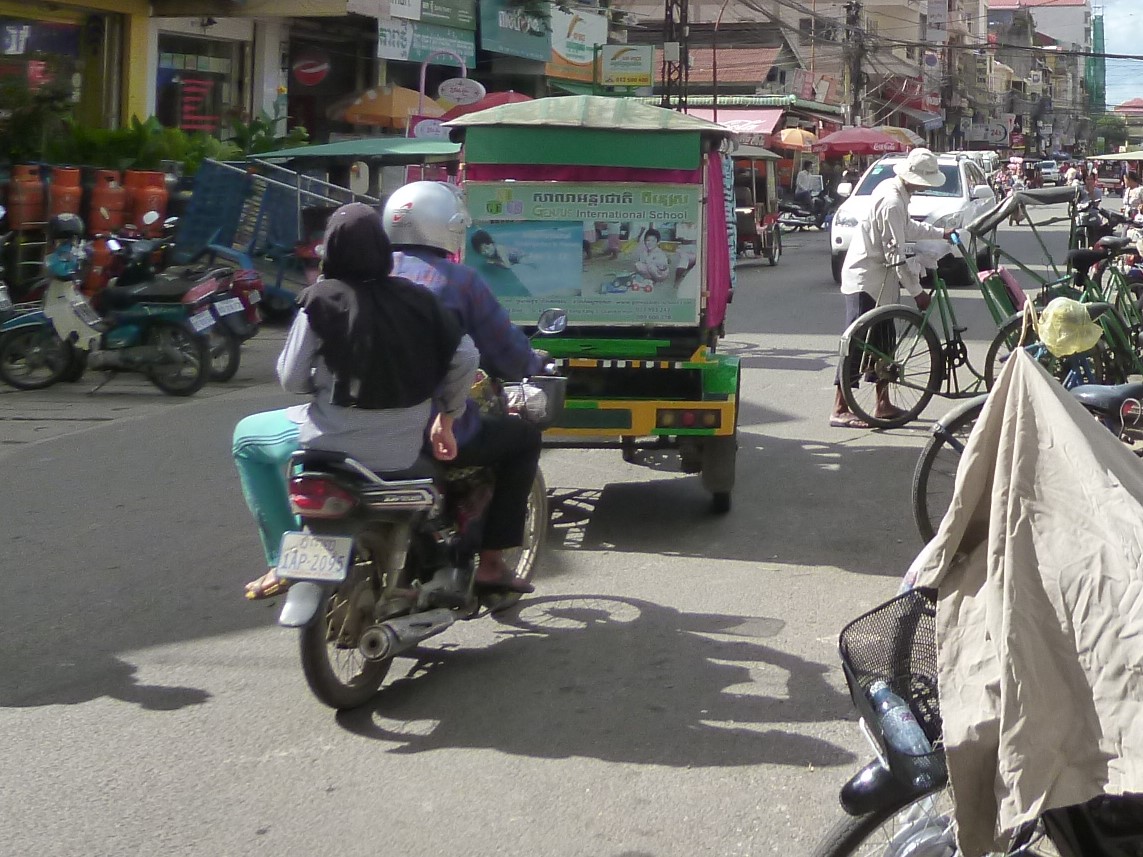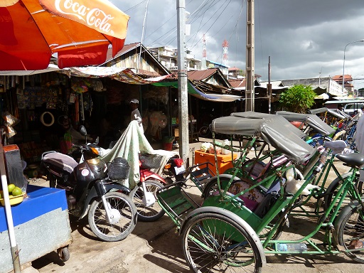 プノンペンの街でうろうろしていると必ず声を掛けてきます。タクシーやトゥクトゥクのような初期投資は不要で、自家のある時に自家用バイクで商売ができるので、費用も安く抑えられています。市内中心はおおむねUS$2ですから手ごろな乗り物です。ただし、先に述べた背景もあり目的地を告げても途中何度も他の人に道を訪ねながら探し当てるといったスタイルです。私もホテル名を告げて地図も見せてから走り始めたのですが、どこを走っているのかバイクタクシーのライダーも分からなくなってしまい、他の人に聞きながらようやくホテルに帰り着くことが出来ました。