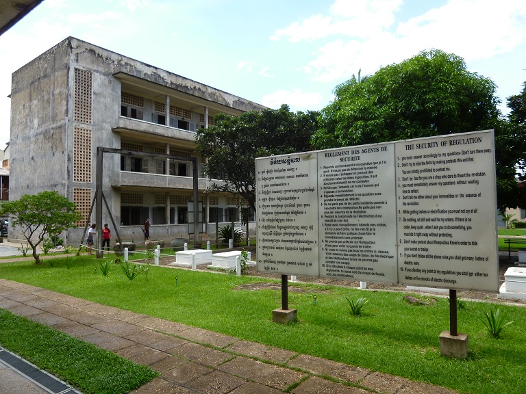 1975年から1979年までのポルポト政権下で行われた自国民に対する拷問と殺害といった狂気を今に伝える博物館です。いわゆる政権にとって邪魔とされた知識人はもとより、アメリカ軍による空襲をのがれたプノンペンに避難していた農民までもがここに収容され、数人を残して再び自由になることはできませんでした。