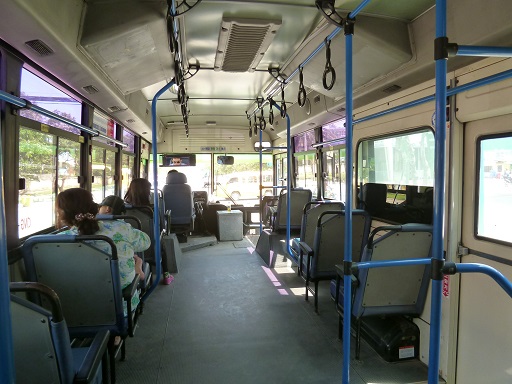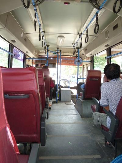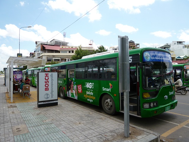 2014年から運行を開始した公共のバスです。運賃は片道1500リエルですから大凡0.38米ドルです。上海のバスとほぼ同じ値段ですが、カンボジアの所得水準からは些か高いのかもしれません、とても空いていました。車両は現代自動車の韓国製中古車両が多く、ハングル語の表記がそこかしこに残っています。なお、運転席の横に運賃箱がありますが、車掌さんが集金するスタイルのようです。空港からのバスである03路線と、ワットプノンやカンボジア日本友好橋に行く02路線ともナイトマーケットがターミナルになっていますので、ここで乗り換えが可能です。