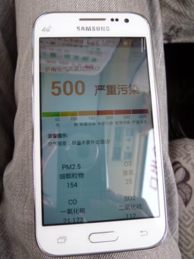 私が訪問した時には大気汚染を示すAQI空気質量表示が500をつけており「厳重汚染」、山東省全体にスモッグ注意報が発令されていました。目盛りが500までしかないので、いわば振り切れたような状態。済南の街がかすんでいるのも頷けます。
