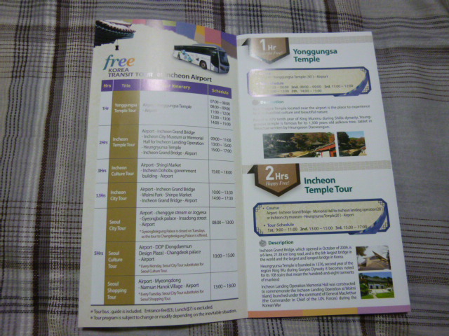 ソウルインチョン空港で他の都市へ乗り継ぐ場合に、無料のトランジットツアーに参加することが出来ます。催行回数が最も多いのはインチョン空港近くの仏閣を訪ねる一時間程度のツアーで、7時、8時、11時、12時、14時の5回催行されています。この他5時間程度のソウルシティーツアー、ソウルショッピングツアーもあります。前者は朝8時のみの催行、後者は8時、10時、13時の三回催行されています。