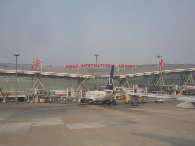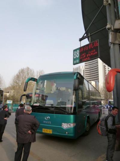 済南の中心からは40km程離れています。市内へは到着ロビーを出てすぐの場所からリムジンバス(一合線)に乗り約一時間で終点の済南駅前のバスターミナルに到着します。片道20元。バスは途中大明湖北口でも停車しますので、そこから済南観光を始めるのも良いでしょう。なお、バスターミナルからのバスは6時から毎正時に出発しています。なお、バスは夜6時ないし7時までの運行ですので、ご注意を。