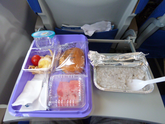 上海虹橋空港から済南への中国国内線で利用しました。朝7時20分に出発するフライトを利用したところ、中国らしいお粥の食事がサービスされました。時間によって相当内容は異なるようで、済南から上海への夜のフライトでは「おはぎ」程度の大きさのパン二つとクッキー、ミネラルウォーターの入ったランチボックスのみでした。