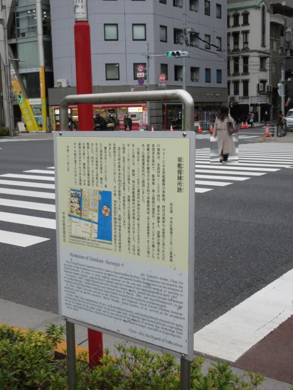 築地の場外市場を北側に抜けて、晴海通り通り沿いに【軍艦操練所跡】の説明プレートが設置されていました。ペルーの黒船来航を受けて、西洋式の海軍の必要性を認識した幕府が、西洋式軍艦の操作を訓練するため、こちらの操練所を設立したとのこと。欧米列強から日本の独立をいかに守るか、そうした戦略的な発想が幕府にも薩長にもあったことから、あの嵐の時代を乗り切ることが出来たのでしょう。「平和ボケ」と言われて久しい日本ですが、こちらのプレートを見て、先人の努力と慧眼に頭が下がる思いがしました。