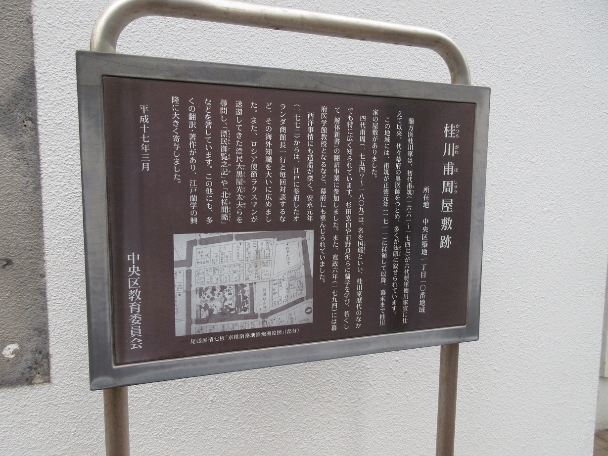 築地駅から銀座方面に向かって歩き、【築地小劇場跡】を見学しさらに歩くと、ビルの外壁前に写真のような説明看板が設置されていました。これが【桂川甫周屋敷跡】で、蘭学者でありお医者さんでもあったことが書かれていました。この説明板以外には当時をしのばせる物はなにもなく、些か拍子抜けしました。