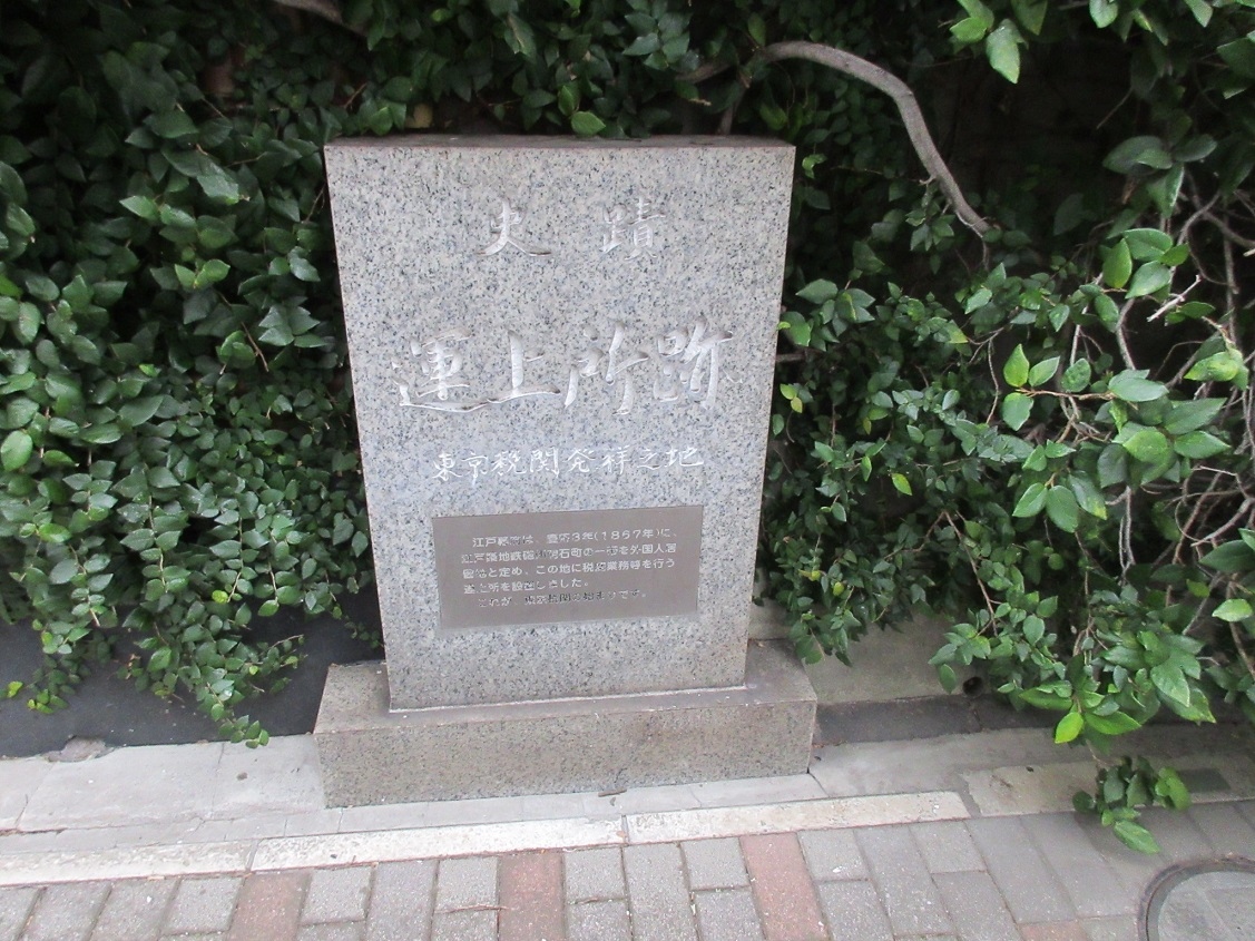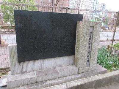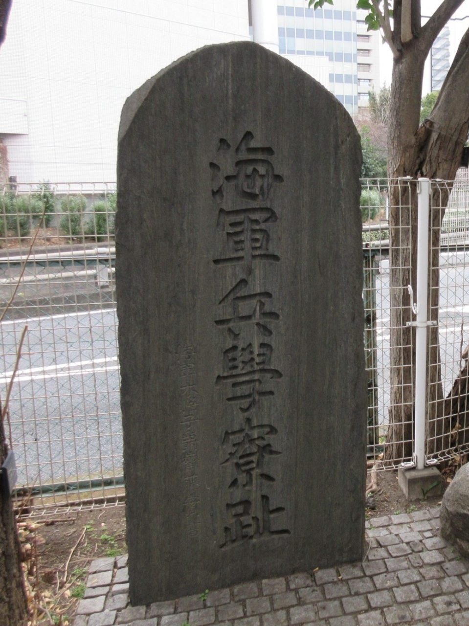 築地界隈を散策し、中央市場通りから国立がん研究センターの脇道を波除通りに向かって進むと、今は首都高となっている旧築地川の東側に面した場所に、こちらの【海軍兵学寮跡】がありました。今は碑があるのみです、かつては海軍の関係施設が多数集まっていたようで、今は痕跡は何も残っていませんが、水兵さんの服装をした若者が闊歩していたのだろうと想像しつつ見学しました。