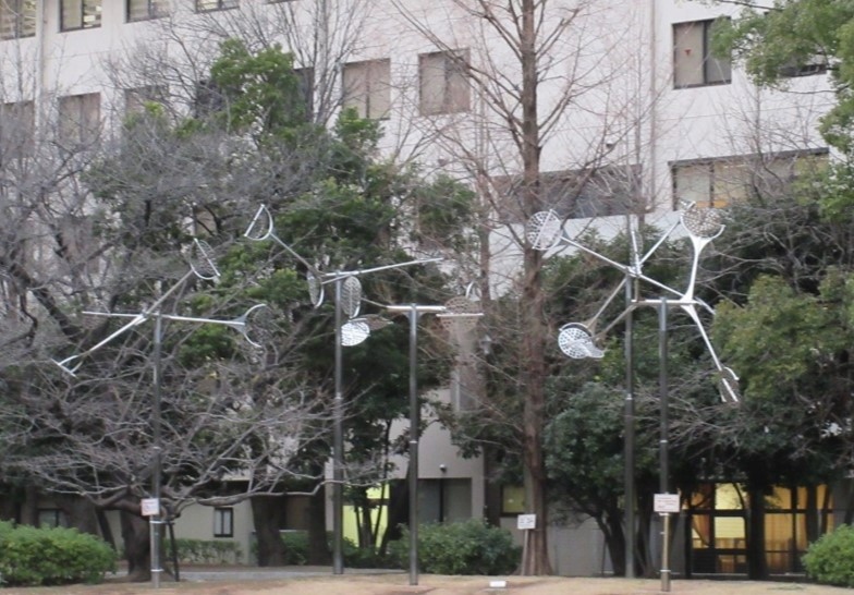 あかつき公園の東端、聖路加タワーにもほど近い場所に、【星の時間】という面白いモニュメントがありました。数本のポールの先に風を受ける羽がついており、これがゆらゆらと動くという仕掛けで、なかなか興味深く見学できました。関西空港の国際線ターミナルの天井にも、同じような発想の風を受けて動く飛行機が設置されていますが、それと似た原理のようでした。