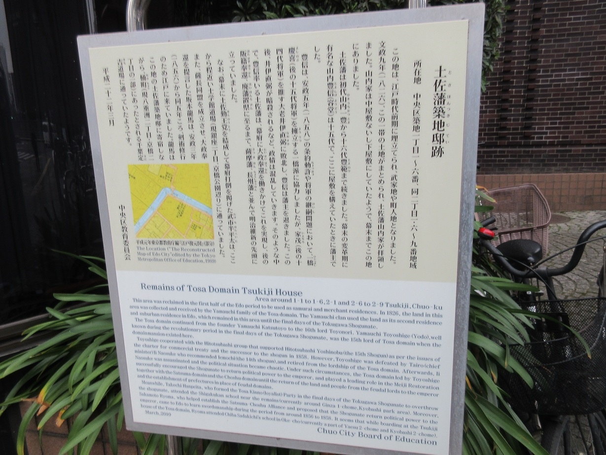 築地界隈を散策した際、中央区役所のすぐ横に【土佐藩築地邸跡】を示す説明板がありました。江戸幕府が成立した時から、江戸は埋め立てを続けて来たわけですが、こちらの土佐藩の邸宅も埋立地の上に建てられたお屋敷だったそうです。土佐藩の山内家は幕末維新の際に「薩長土肥」といわれる位に維新の原動力となったことから、説明板を通じて、多くの維新の志士がここに集ったのではないかと想像力が掻き立てられました。