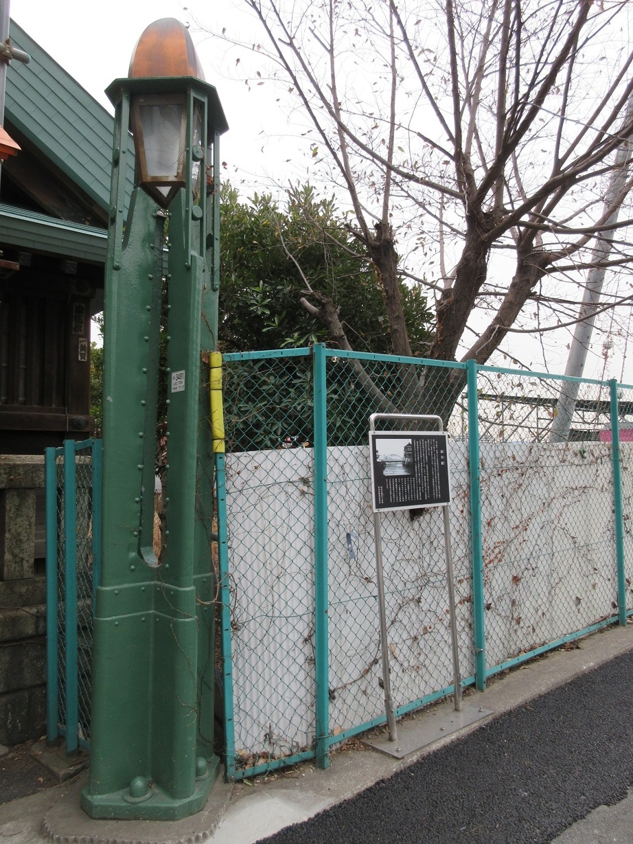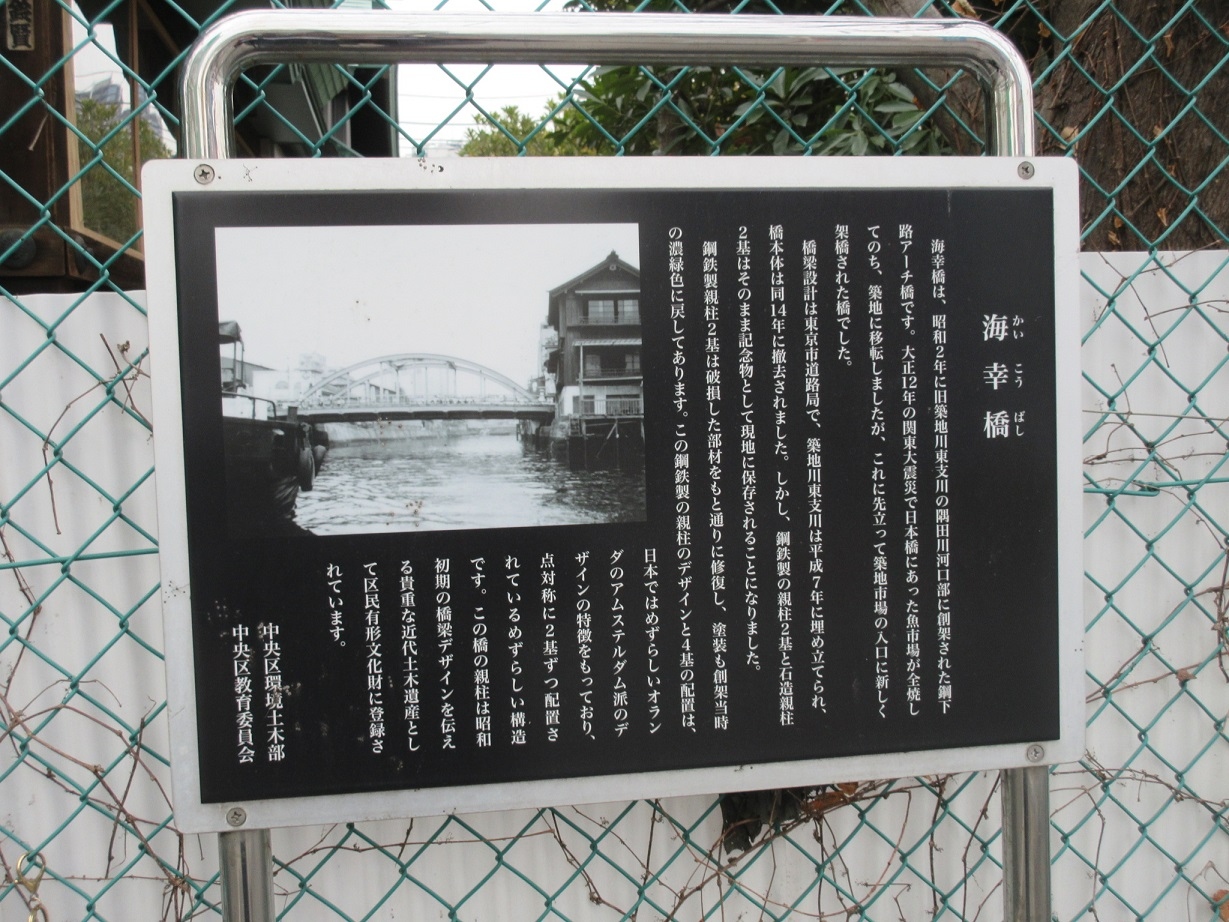築地の場外市場を見学し、そのまま波除通りを東に進んで、【波除稲荷神社】の鳥居に向かって右手に【海幸橋】の説明板が設置されていました。こちの橋は築地川東支川に架かっていたとのこと。当時の写真も説明板に使われており、さらに緑に塗られた鉄骨の親柱もあってイメージがつかみやすかったです。