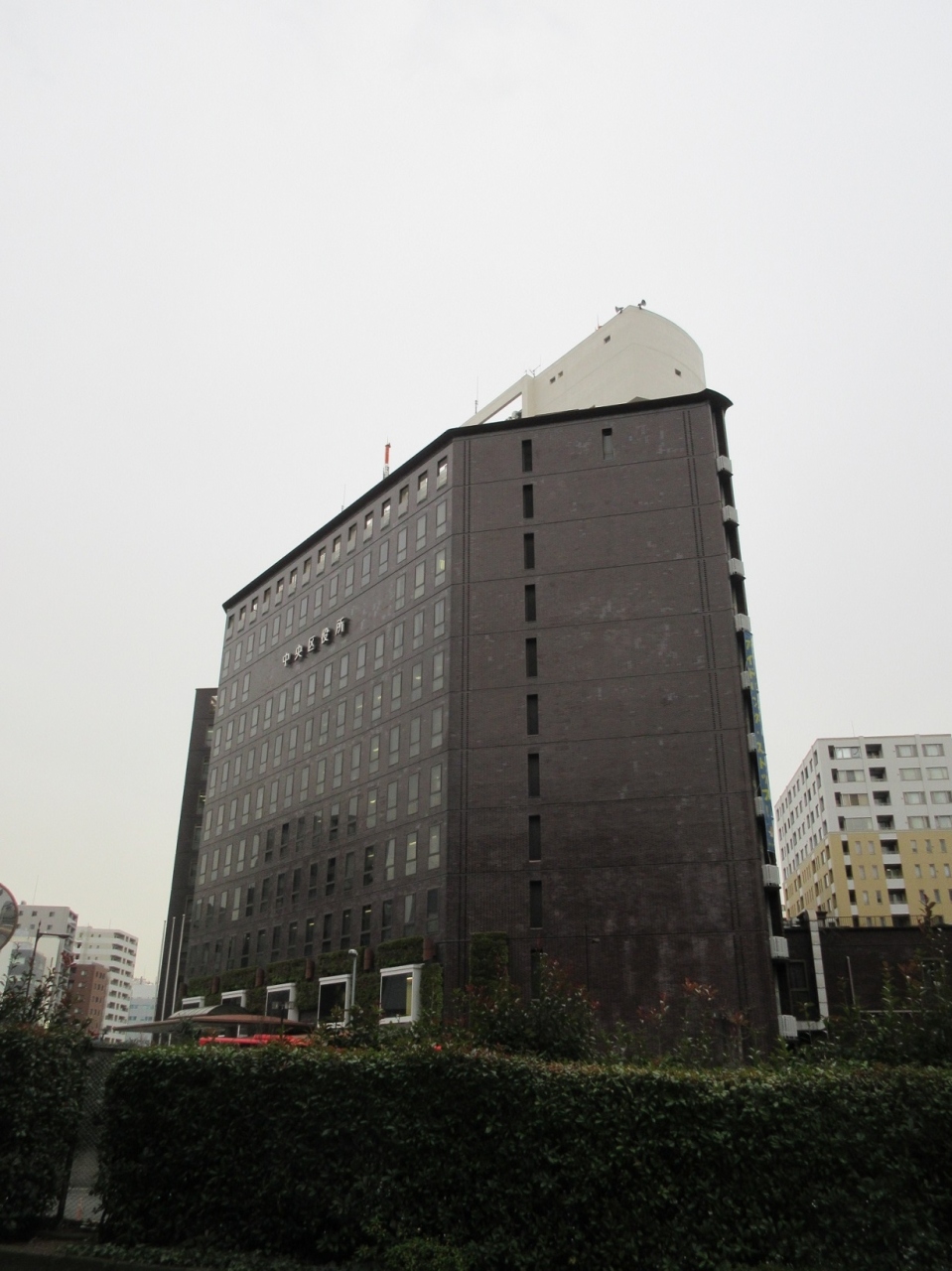築地界隈を散策した際、こちらの首都高速道路にかかる三吉橋の袂にある【中央区役所】にも立ち寄りました。すでに築五十年を超えていると思われる古めかしい風貌で、ゴジラタワーともいわれた文京区役所と比較すると、昭和の時代らしさが感じられました。濃い茶色のタイル張りの外壁も一因だと思います。