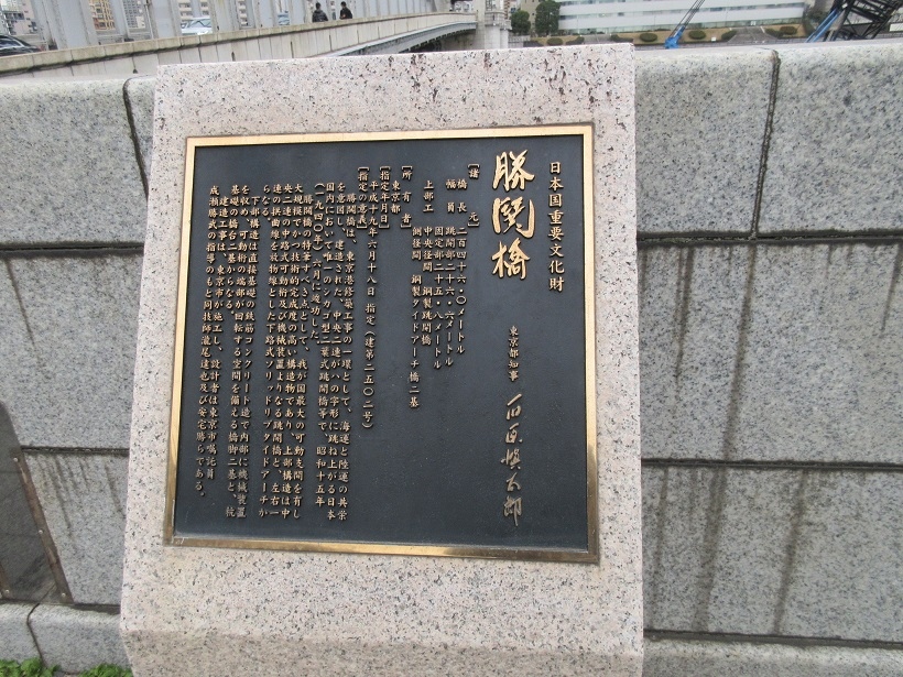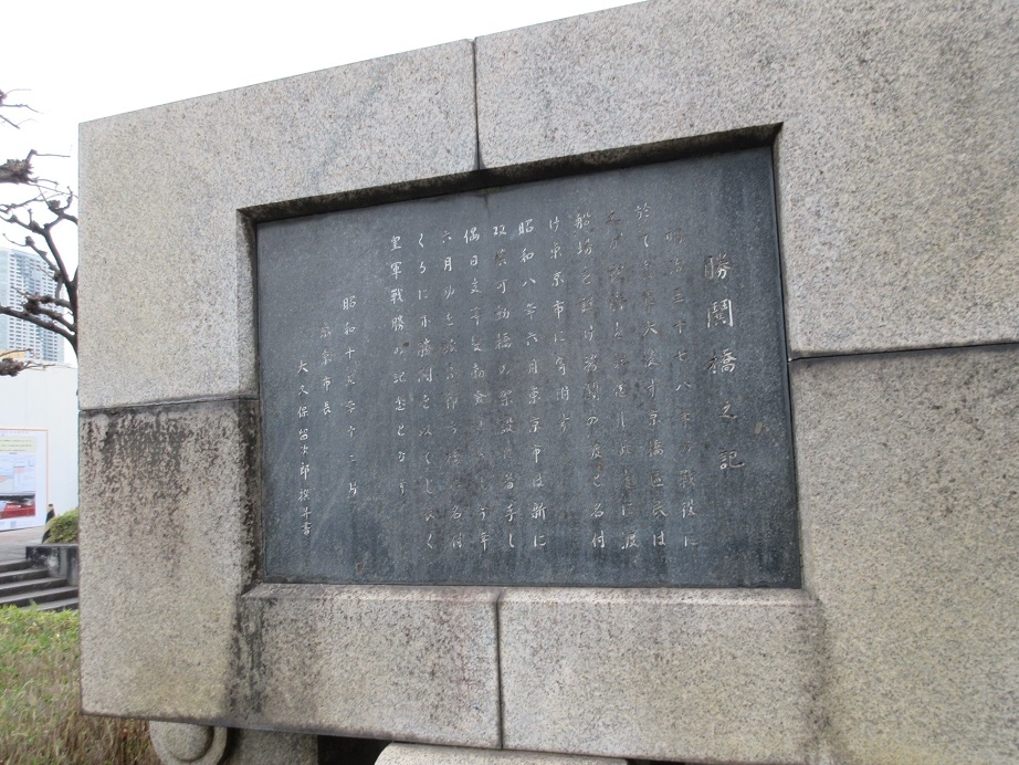 築地から佃島界隈を散策した際、勝鬨橋の手前にこの碑がありました。昭和15年に「海運と陸運の共栄」を図るべく、橋の中央部が跳ね上がる、可動式の当時の最先端の技術でもって作られたことが記されていました。当時は起元節では二千六百年の節目にあたり、東京オリンピックも計画されていた時代。まさにそうした時代の息吹を感じとることが出来ました。