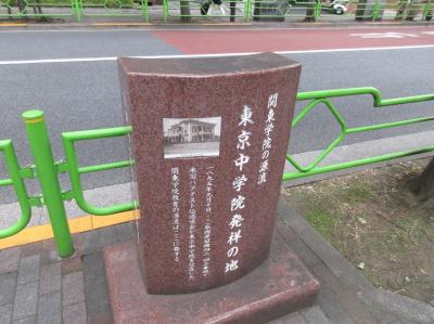 【雙葉学園発祥の地】からすぐそばに、【東京中学院発祥の地】の碑を見つけました。茶色の石材を使ったシンプルなデザインの碑で、現在の関東学院の源流になった学校だったことが分かりました。当時の白黒写真も使って説明されており、初めて目にする私のような来訪者にとっても理解しやすいよう工夫されていました。