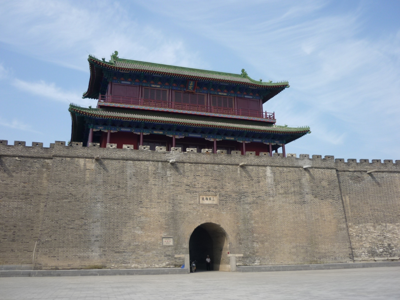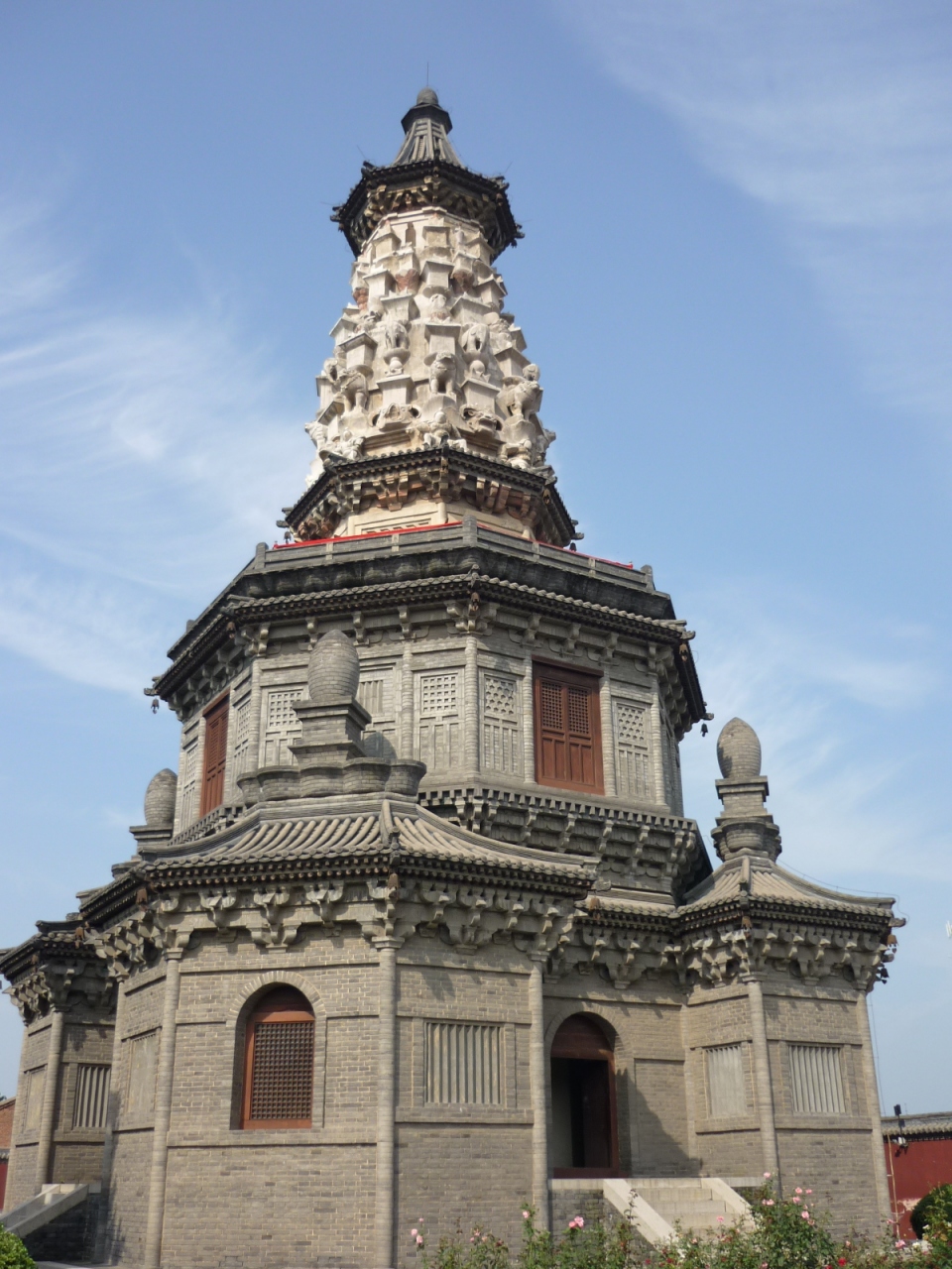 石家荘の中心部、長安公園北西のバス乗り場から132路のバスで一時間、正定県バスターミナル(ターミナルと言っても大きな駐車場という程度)下車。他にも、石家荘南焦バスターミナルから177路のバスで一時間半ほど開元寺下車も可能です。正定県の南側城門のほど近くに、その優美な姿を見せる広恵塔は金の時代、すなわち今から800年ほど前の建築です。八角形の低層の上に今から正に花開かんとする蕾のような形の尖塔を乗せた特徴的な外観を誇ります。中国でもこうした形状の塔は十数基のみとのこと。高さ約40mの塔に登ると、のどかな田園風景が広がります。