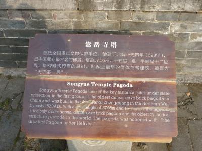嵩岳寺塔は2010年に「『天地の中央』にある登封の史跡群」として世界遺産に登録されています。高さ40mとそれほど大きな塔ではないのですが、北魏の6世紀頃に建てられ中国で最古のレンガ造の密櫓式仏塔とのこと。12角形をした1階部分(密櫓式なので実際には○階と表現すべきでないかもしれません)から見あげると複雑な構造の天井を見てとることが出来ます。また、周囲にはこれと言った高い建物は皆無であり、遠くからでも非常に目立ちます。少林寺だけではなく、足を延ばしては如何でしょうか。