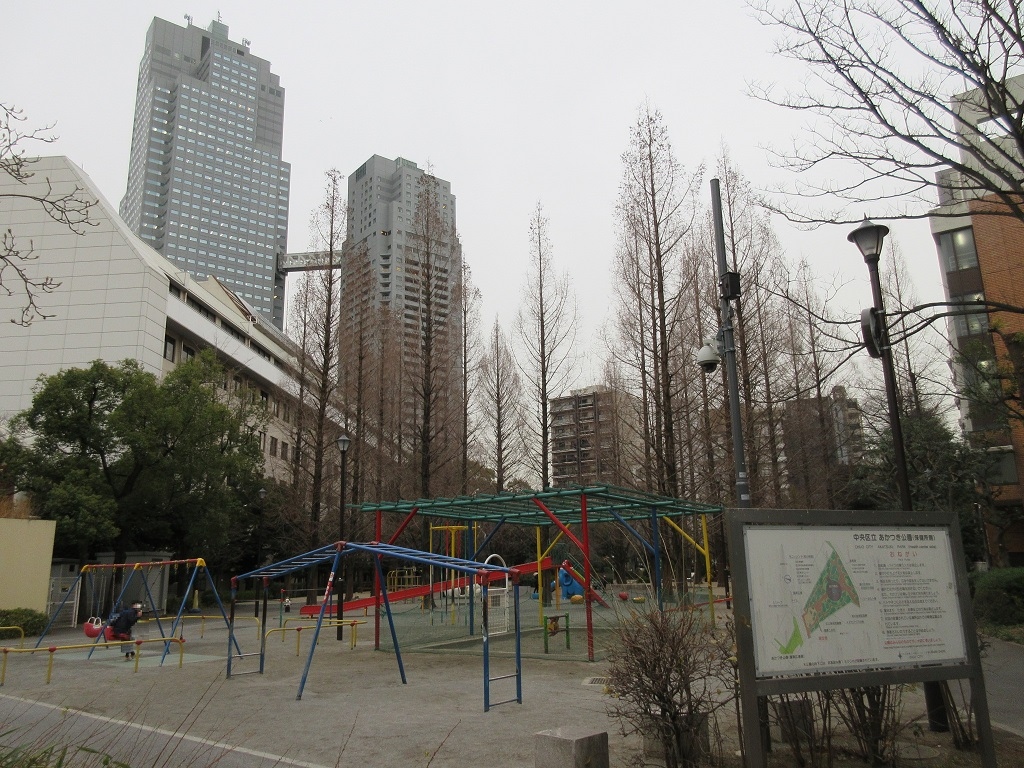 築地界隈を散策した際、聖路加病院からほど近い場所に、東西に道路を挟むかたちで広がっている【あかつき公園】があり、立ち寄りました。子供達が喜びそうな遊戯施設もあれば、シーボルト像のような歴史を感じさせるスポットもあったりと、年齢を問わずに楽しめる公園でした。