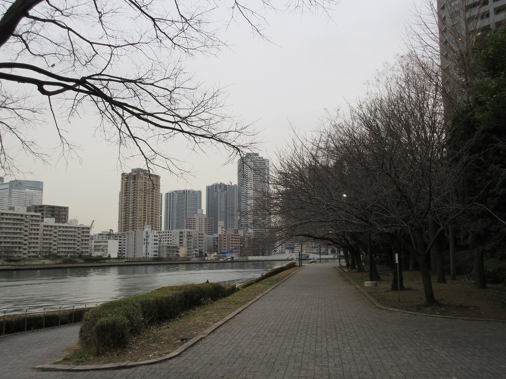 聖路加ガーデンからほど近い場所にある、隅田川に沿った南北に長い河岸公園が【明石町河岸公園】です。この日は佃島に渡ろうと佃大橋に向かう途中、こちらの公園を散策しました。川面をふく風に吹かれながら、隅田川を挟んで佃島のタワーマンション群のダイナミックな景観を楽しむことが出来ました。