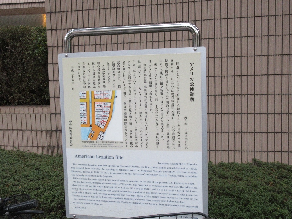 築地界隈を散策し、聖路加ガーデンタワーあたりまで来た時に、植え込みの一角にある案内板に目が留まりました。その説明によると、日本の開国後のアメリカ公使館がこの場所にあったとのこと。外国人の居留地になっていたことから、このような施設がもうけられたのだろうと、容易に想像できました。何かレンガ壁のような物などあればイメージが更に沸くのですが、そうした物は皆無で説明板のみでした。