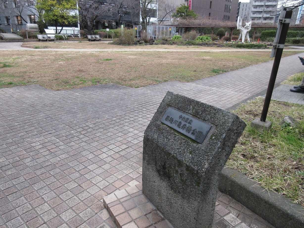 築地界隈を散策した際、今は首都高の上にかかる「亀井橋」に隣接するかたちで整備された【亀井橋公園】に立ち寄りました。芝生が植えられた公園で、かけっこなど出来そうな広々とした空間が広がっていました。もとより周りは警察署や中央区役所があって、繁華な場所ではないですが、私が訪問した際は今にも雨が降り出しそうなお天気で、公園には散策する人もおらず物寂しい位でした。