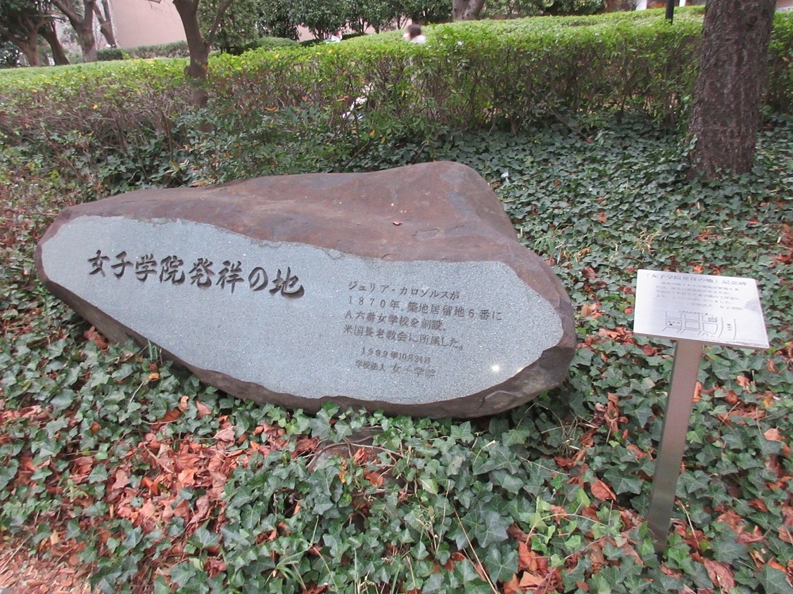 築地界隈を散策して、聖ルカ通りに面した聖路加国際大学の植え込みに、【女子学院発祥の地】と書かれた記念碑があり、足を止めました。明治の初めにここ築地の居留地に開設された女学校がその発祥の地になるようで、男尊女卑のイメージの強い戦前の日本ですが、こうした女性への教育は明治時代から始まっていたことを知り、認識を改めることが出来ました。