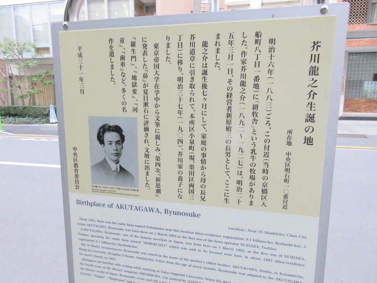 築地界隈を散策していた際、聖路加国際大学近くに【芥川龍之介生誕の地】を示す案内板が設置されていました。【クモの糸】や【羅生門】など、誰でも一度は読んだことがある小説を書いた芥川龍之介の生誕の地が築地にあったとは知りませんでした。彼の母親がこの地で牛乳屋を営んでいたことなど、詳しく記載されていました。居留地通りを築地川公園に向かって歩くと場合、公園手前の左手に設置されていました。