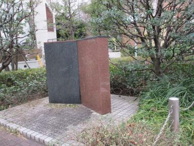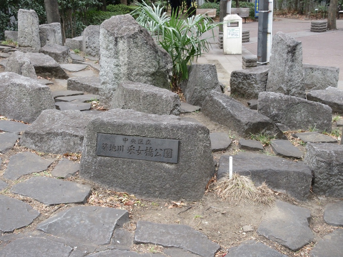 采女橋と新橋演舞場の間の小さな公園で、いろいろな形の石が配置され、公園の顔となっていました。首都高の上に設置された橋に隣接する公園には、芝生を敷き詰めた公園や、名犬チロリの碑をもうけるようなかたちで整備された公園もありますが、こちらはまさに石がキーワードにしているように感じられました。