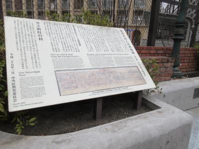 築地界隈を散策した際、明石小学校の道路に沿った一角に【築地居留地跡】と書かれた説明書きのプレートが設置されていました。居留地時代のイギリス積みの煉瓦塀や、ガス灯などが展示されていて、文明開化に沸いた時代に、しばし思いをはせることができました。