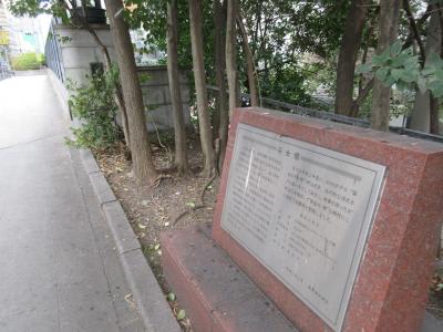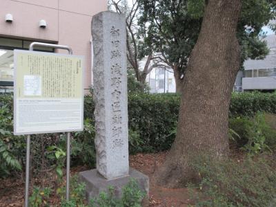 赤穂浪士の討ち入りで有名な、赤穂藩浅野家の上屋敷があったことを示す大きな説明文と碑が設置されていました。