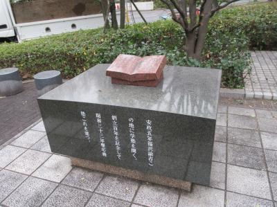 築地界隈を散策した際、聖ルカ通りと居留地中央通りの交差点にあるこちらの記念碑に目が留まりましtあ。福沢諭吉が安政年間に開塾したことから、「慶応義塾開塾の地」を示す碑と、「蘭学の泉はここに」の碑がまとまって立っていました。後者は書籍を開いて垂直に立てたような形状をしており、残念ながら文字が読みにくかったですね。