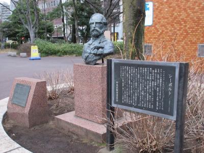築地界隈を散策した際に立ち寄った、東西に長いあかつき公園内の一番東端にありました。子供の遊び声が響く公園の一角に、立派な紳士の胸像があり、それが【シーボルト像】でした。江戸時代の後期、1823年に来日して蘭学者に指導をした事など、彼の功績を説明する文章もあって、理解の助けになりました。