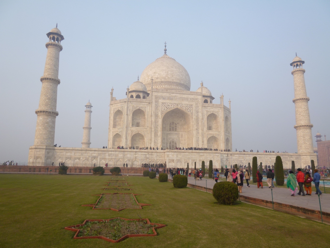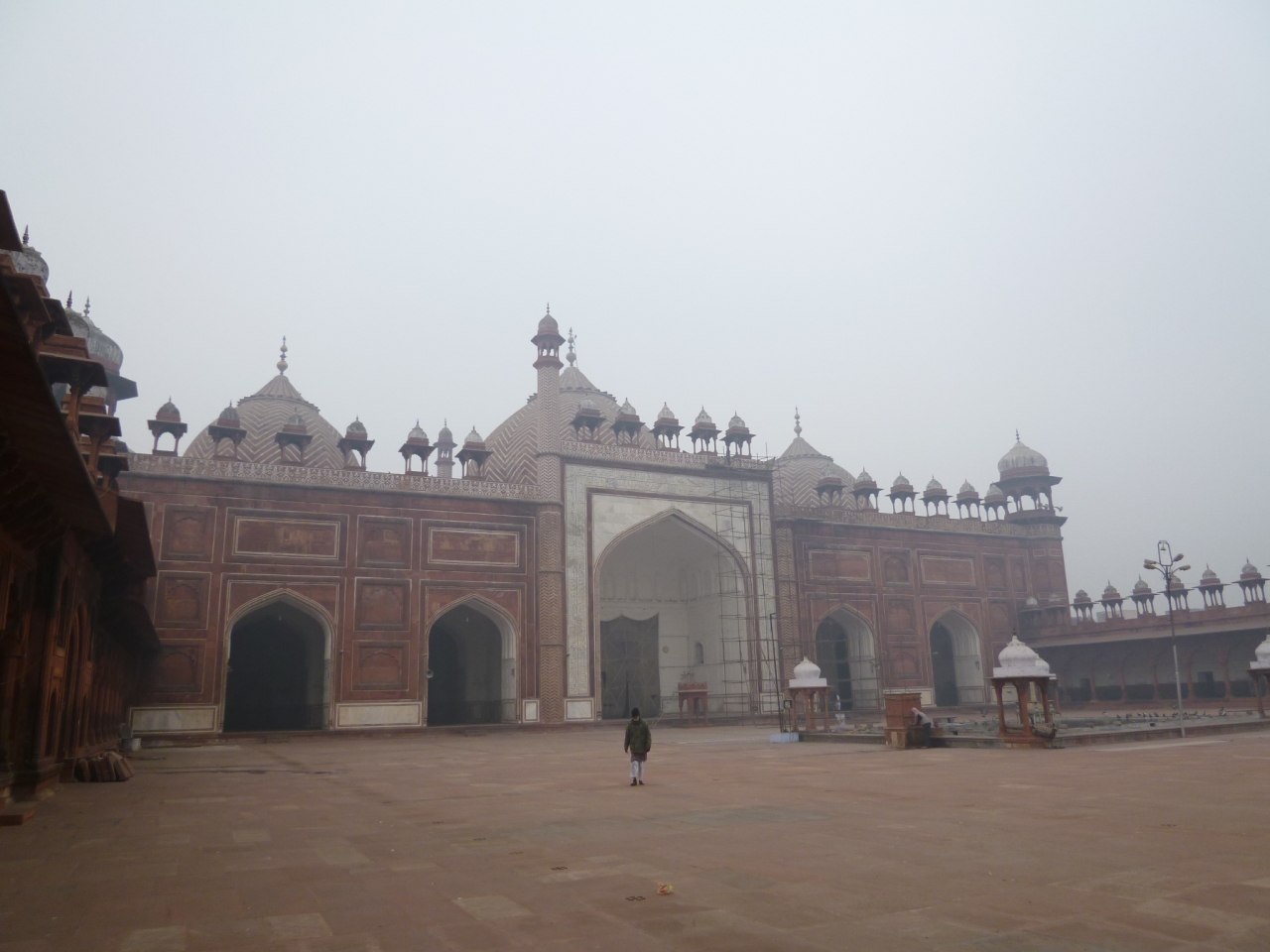 映画スラムドッグミリオネアにも登場、インドを代表するイスラム建築です。映画では、見学時に観光客も靴を脱がねばならない点に着目した主人公が、高級そうな靴を何足も失敬して売り払うという場面がありましたね。ビニールに入れて持ち歩くのが最も安全かも。また、大理石の上を歩くため、冬場は二枚重ねできる靴下を用意した方が良いでしょう。また、冬場は霧の出る日が多いらしく、この日も午後3時過ぎてようやく晴れてきました。スケジューリングの際はその点ご留意を。