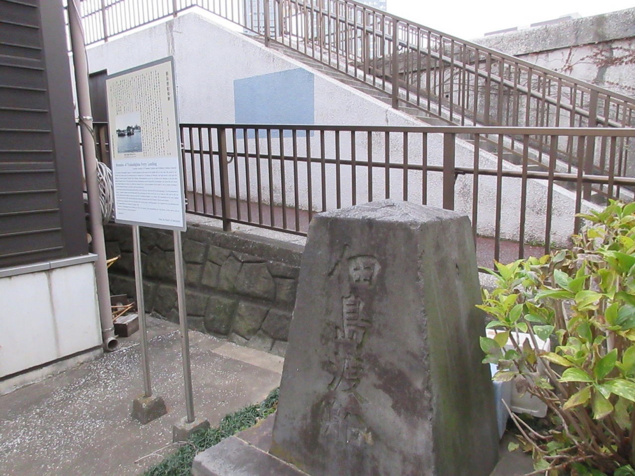 江戸時代に隅田川を埋め立てて造成された佃島と対岸とは、何百年もの長い間、渡船の運航がされていたとのこと。そうした歴史を今に伝える標識と石碑が、佃島の佃公園の近くにありました。ただ、公園のテラスから一段下がった場所にあり、少し見つけにくなったですね。