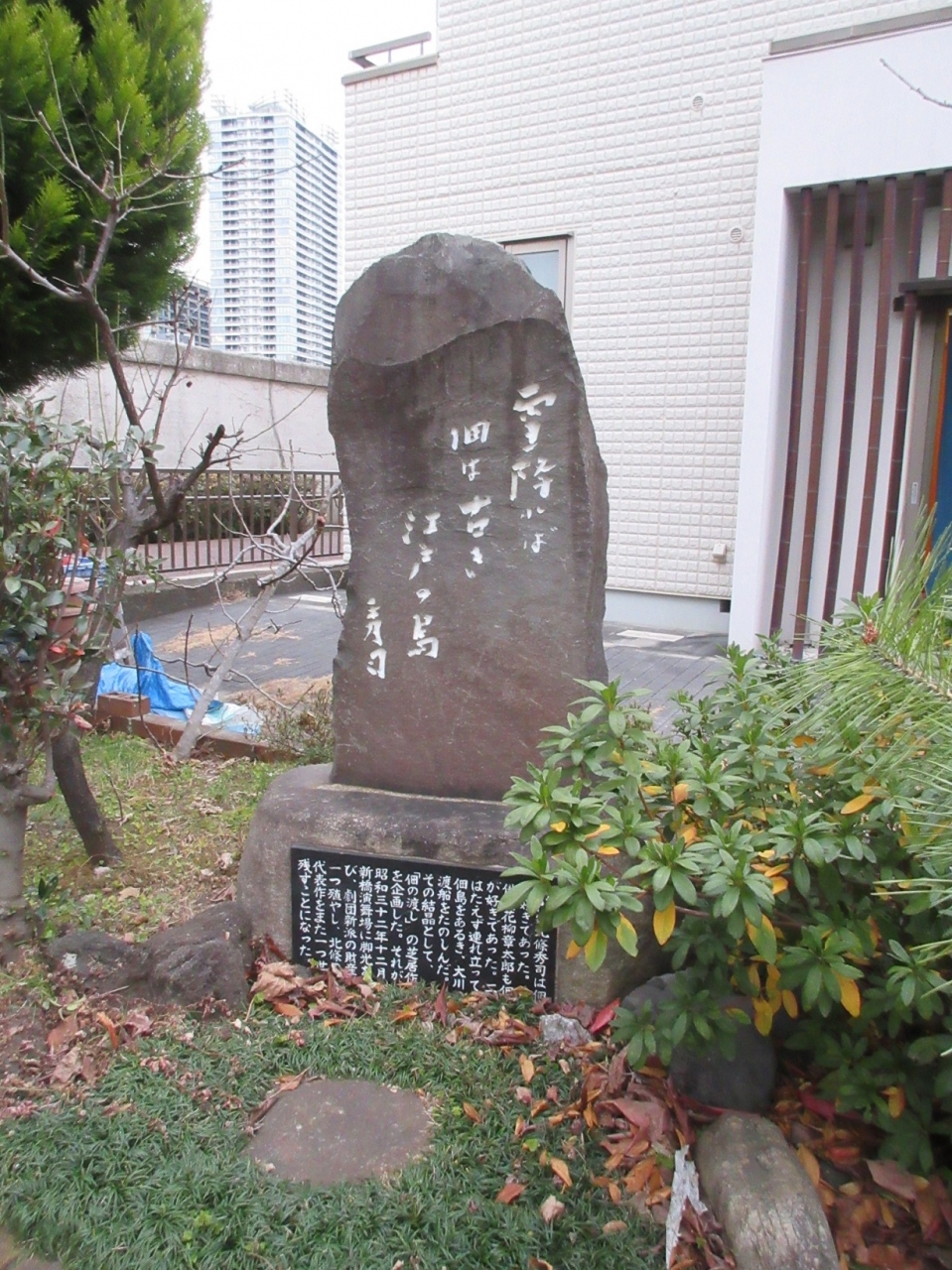 佃大橋を渡って佃公園界隈を散策していた際、住吉神社と佃公園の間の小さな空き地になった場所に、【佃島渡船場跡】の碑と、こちらの【北条秀司句碑】がおかれていました。とても立派な大きな石碑で、さらに彼の句の下の土台となる石には、昭和の劇作家であった彼の功績についての説明文がありました。