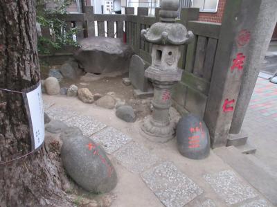 狭い境内に、「さし石」と赤い文字が刻まれた楕円形の石がいくつかおかれていました。