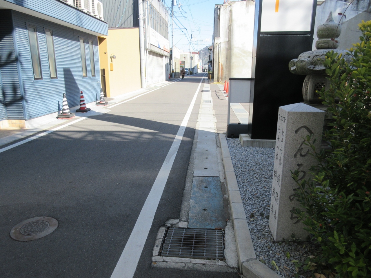丸亀を代表するアーケード街といえる【通町商店街】から直角に東方向に伸びる通りが【松山町商店街】です。ちょうど道の脇に「遍路道」とかかれた石碑があり、それが目印になっていました。営業しているお店も少なく、住宅街と大きな違いがない寂しい通りで、観光客が訪問するようなスポットではないと感じました。