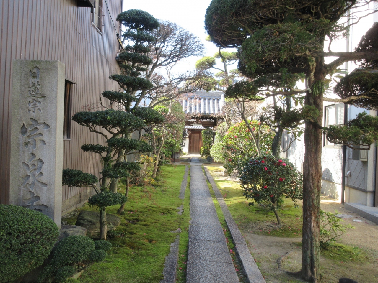 丸亀中心部の寺町界隈を散策した際、こんぴら街道に面したこちらのお寺に立ち寄りました。苔むした細い参道の脇には、色鮮やかなさざんかが咲いており、丁度よいアクセントとなっていました。また、この細い参道の奥には手入れの行き届いた境内が広がって居ました。