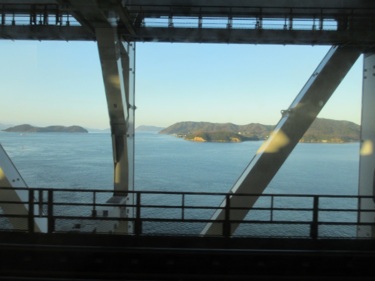 昭和の末期に開通した、瀬戸内海を挟んで本州の倉敷市と四国の坂出市の間を結ぶ、全長10km近い長大な橋が瀬戸大橋です。今回、丸亀城の天守閣に登った際に、その雄大な姿を思う存分堪能することが出来ました。坂出にも見学できるヴュースポットがあると聞いていましたが、複数の橋をつないでいる形状などは、丸亀城からの方がはっきりと見て取れると思います。鉄道でも岡山から高松、坂出から岡山と2回この橋を通りました。鉄骨が邪魔をしてしまい、写真はなかなかうまく写せませんでした。