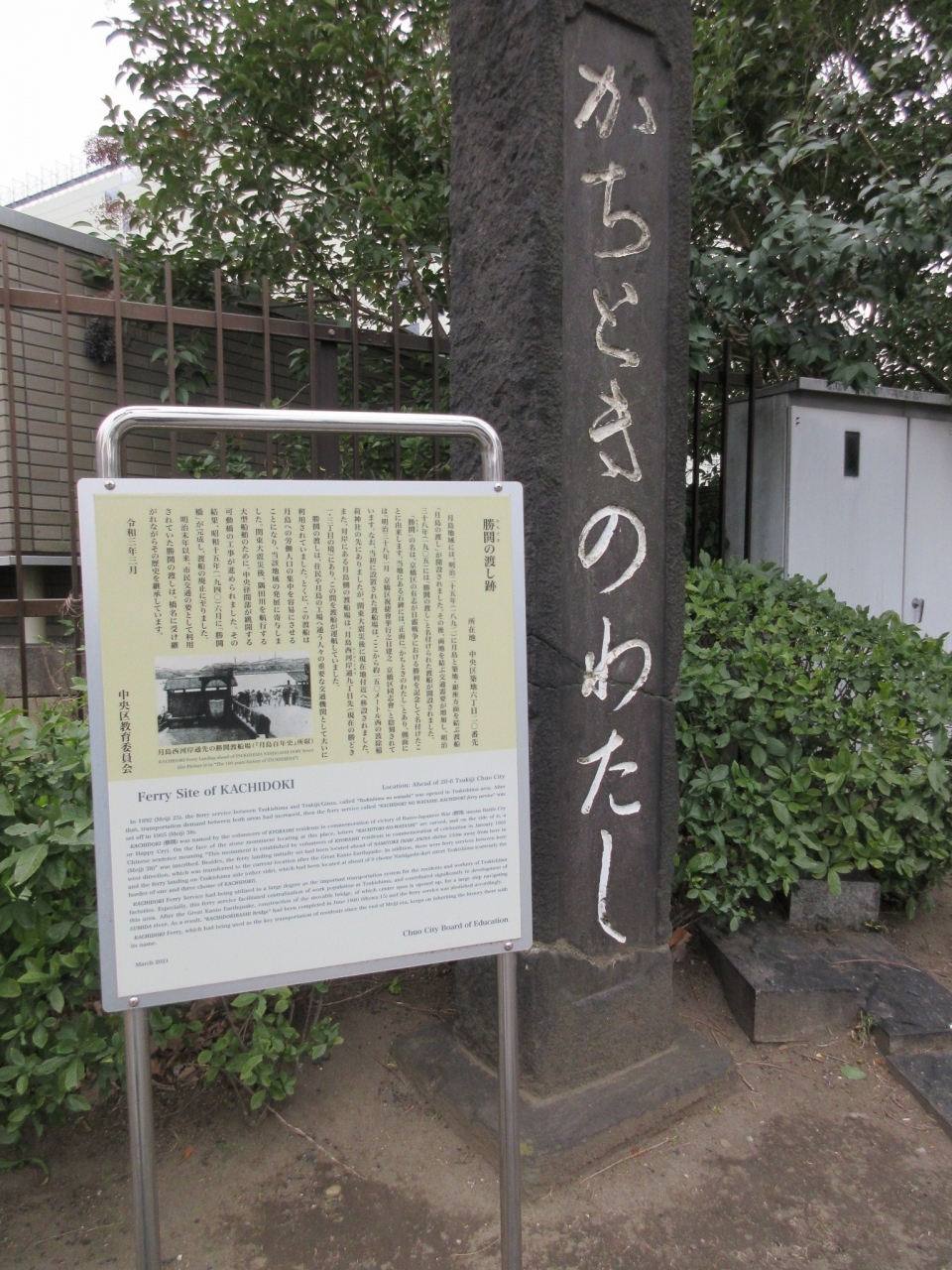 「かちときのわたし」と書かれた【勝鬨の渡し跡】を示す石碑と説明書きが設置されていました。