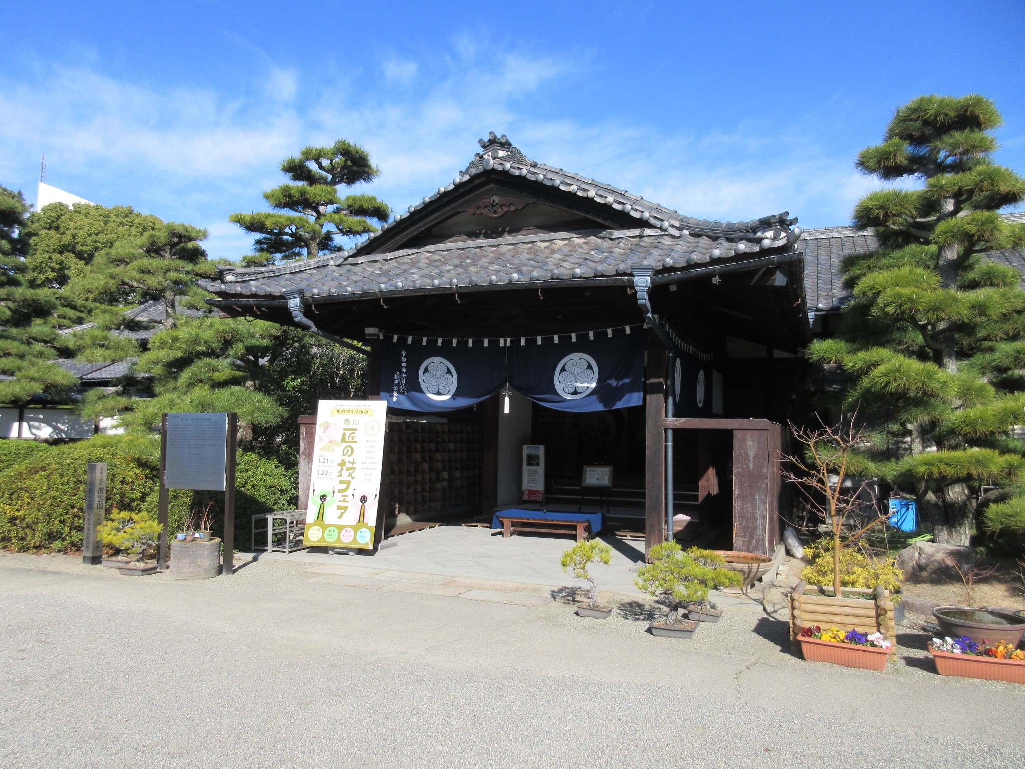 高松城跡内を訪れた際に、武家屋敷のような立派な御殿があり見学しました。大正時代に旧高松藩当主の別邸として建てられた邸宅で、木造の御殿はいくつもの部屋からなり、そのうちの一部を公開していました。靴を脱いで邸内に入ると、丁度地域のイベントが開催されていて、大勢の方でにぎわっていました。