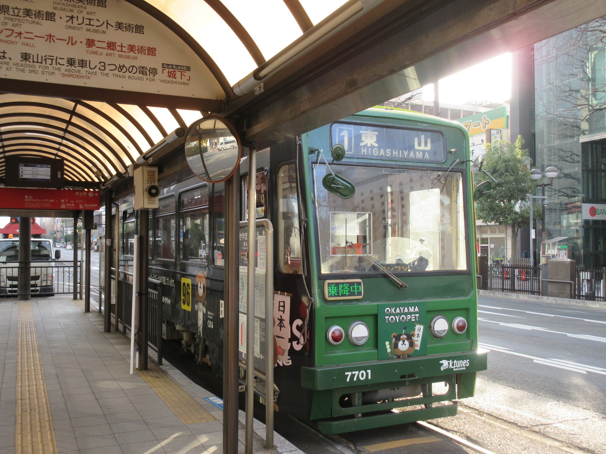 岡山滞在中に何度から利用しました。岡山駅の東口のビックカメラ前に起点にしており、東山線と清輝橋線の2路線ありました。おおむね約15-20分間隔で運行されています。この日は岡山城や後楽園に向かいたかったので、東山線で「城下」電停まで乗車しました。通勤・通学の時間ではなかったので混んでおらず、座ることが出来ました。